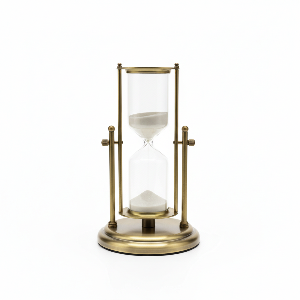 Orë rere dekorative elegante me trup qelqi, rërë të bardhë dhe bazë metalike ngjyrë ari, ideale për tavolinë apo raft. Shtoni një prekje klasike dhe moderne njëkohësisht në çdo ambient të shtëpisë ose zyrës.