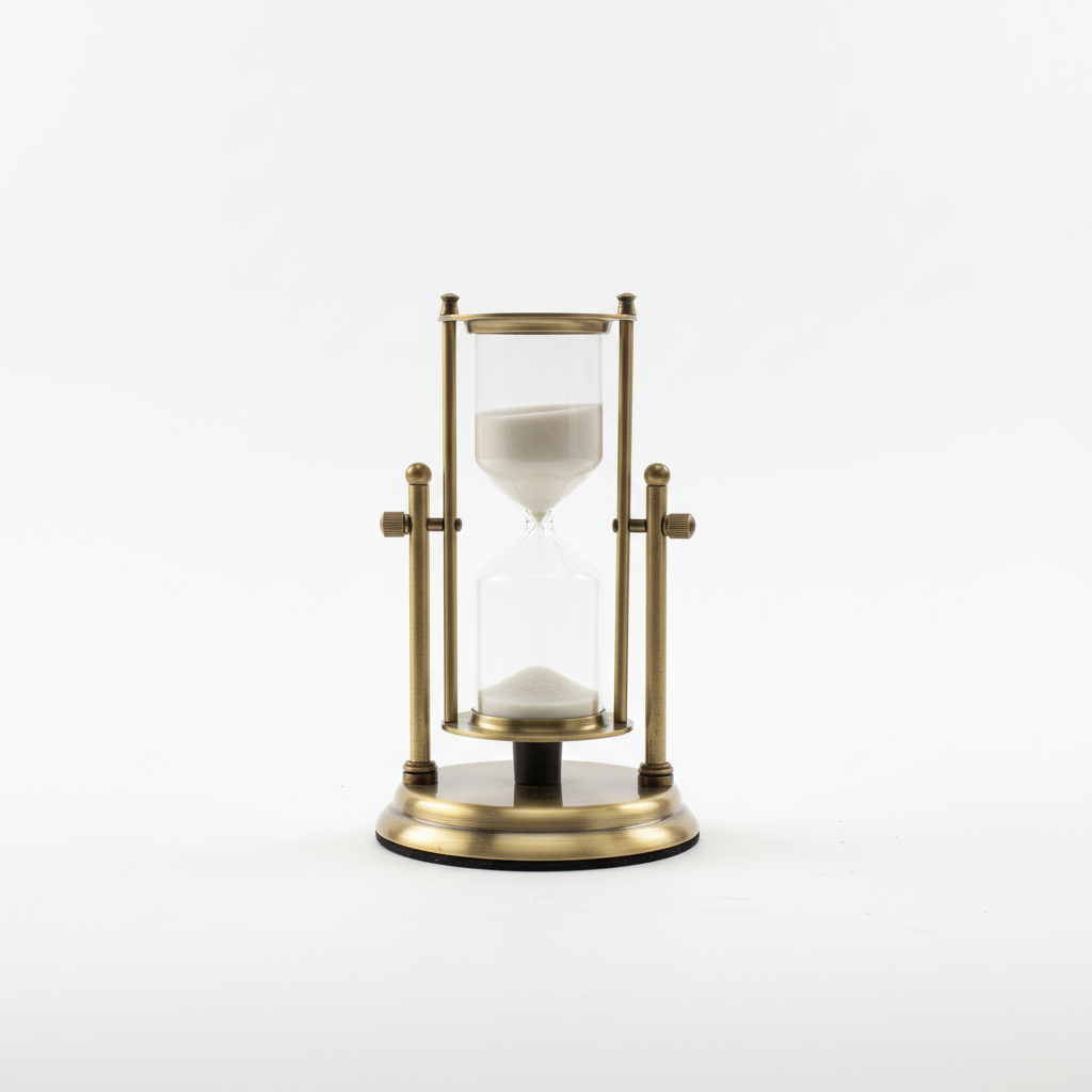 Orë dekorative rere me dizajn vintage, me bazë dhe kornizë metalike në ngjyrë ari dhe kupë qelqi transparente me rërë të bardhë, ideale për çdo sipërfaqe tavoline në shtëpi apo zyrë.