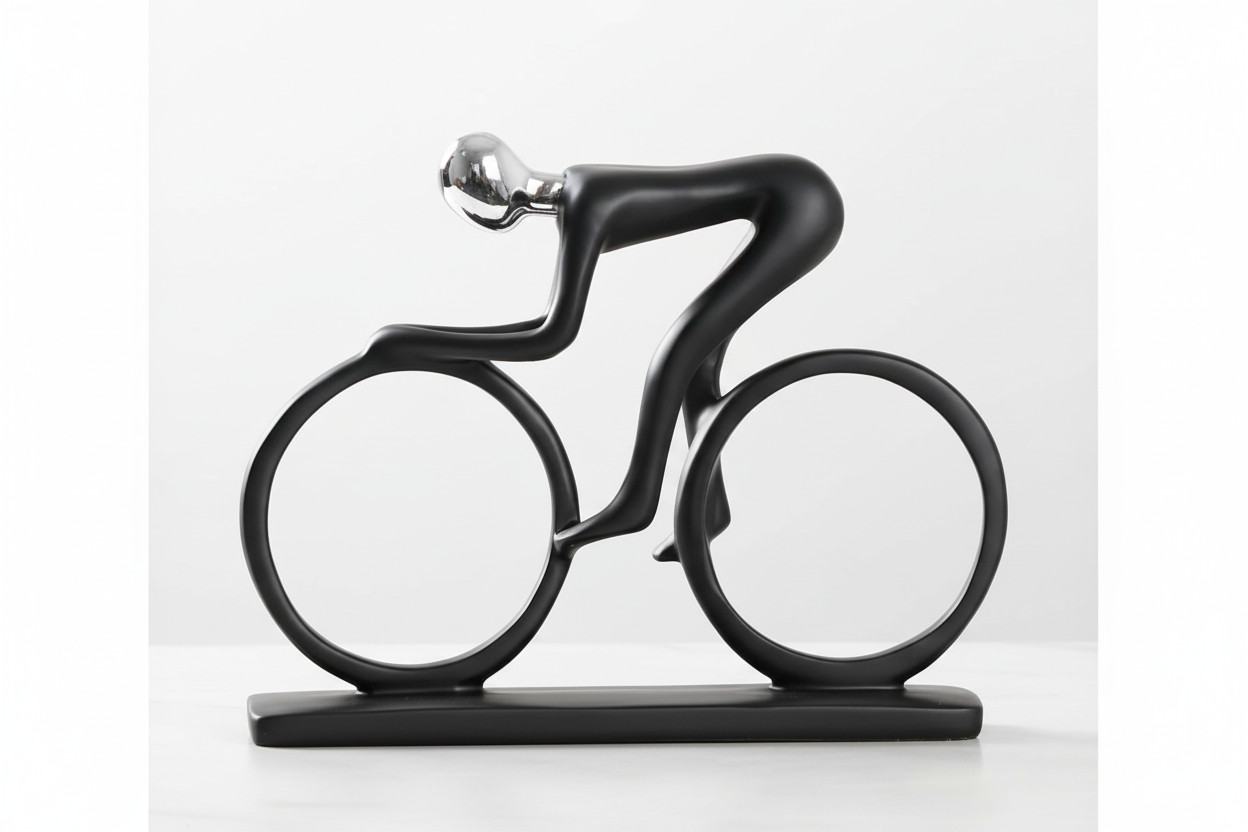 Aksesore dekorative moderne me formë abstrakte çiklisti, e realizuar me linja të pastra dhe stil minimalist. Dizajni elegant në ngjyrë të zezë mat kombinohet me detajin metalik krom në pjesën e kokës, duke krijuar një kontrast modern dhe të sofistikuar.