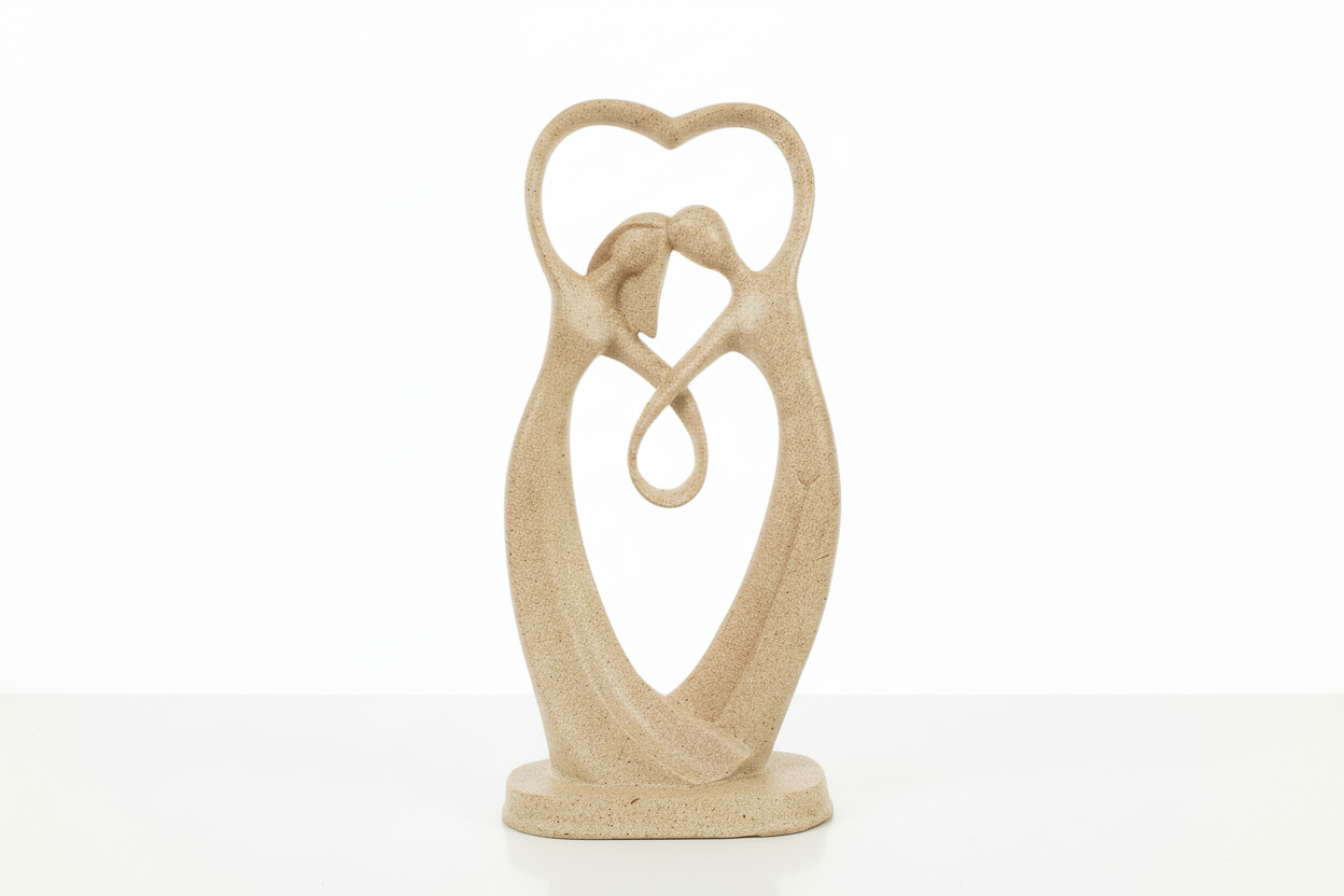 Statujë dekorative me dizajn artistik që paraqet një çift në një moment përqafimi, e formuar në mënyrë elegante brenda një siluete në formë zemre. Linjat e buta dhe forma abstrakte krijojnë një ndjesi harmonie, dashurie dhe lidhjeje, duke e bërë këtë dekor ideal për ambiente romantike dhe moderne.