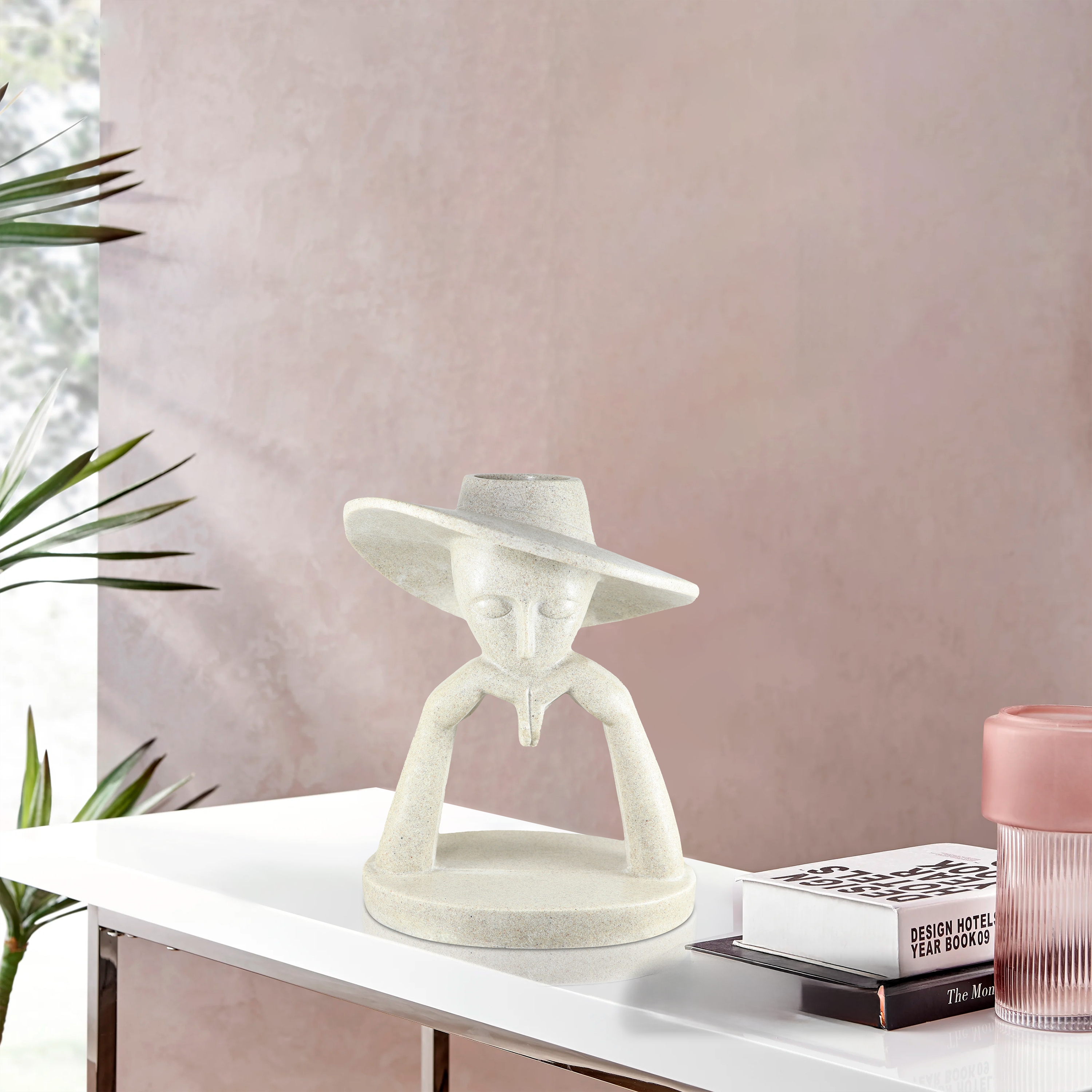 Aksesore dekorative me dizajn artistik dhe stil minimalist, e realizuar në tonalitet natyral bezhë me teksturë guri. Forma abstrakte e figurës me kapelë të gjerë krijon një pamje elegante dhe moderne, duke i dhënë ambientit karakter unik.