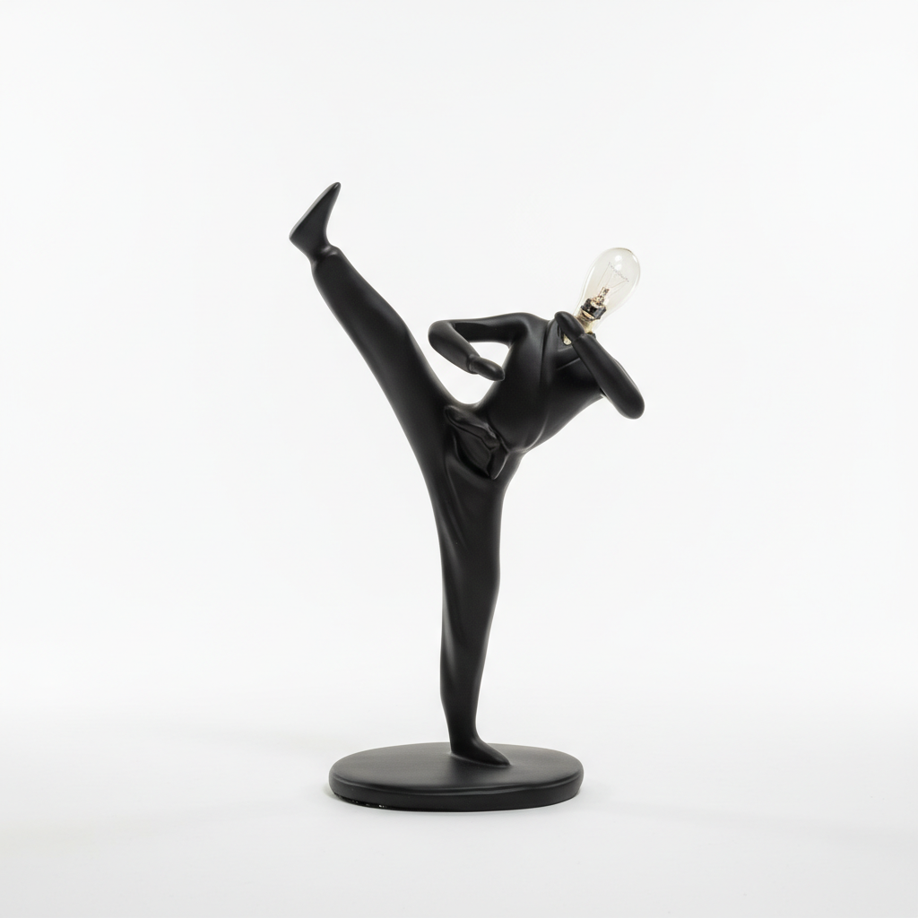 Figurinë dekorative moderne në ngjyrë të zezë, që paraqet një personazh në pozë të lartë kick arti marcial me kokë në formë llambë argjendi. Aksesori ideal për të sjellë energji dinamike dhe stil bashkëkohor në çdo ambient.