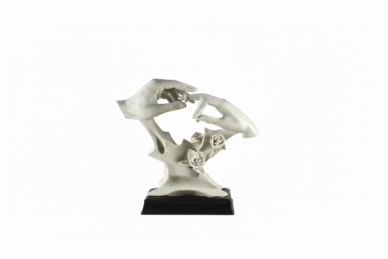 Ky aksesor dekorativ me formë duarsh të ndërthurura përfaqëson një moment simbolik lidhjeje dhe harmonie. Detajet e luleve i shtojnë një prekje romantike dhe artistike, duke e kthyer këtë objekt në një element të veçantë për dekorin e shtëpisë.