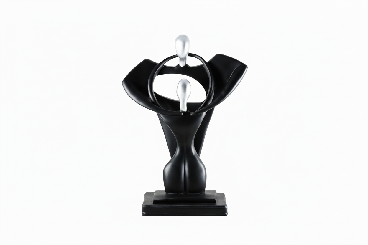 Ky aksesore dekorativ me dizajn abstrakt sjell një prekje artistike dhe moderne në çdo ambient. Forma elegante në ngjyrë të zezë mat, e kombinuar me detajet në argjend, krijon një kontrast të rafinuar që tërheq vëmendjen dhe i jep karakter hapësirës.