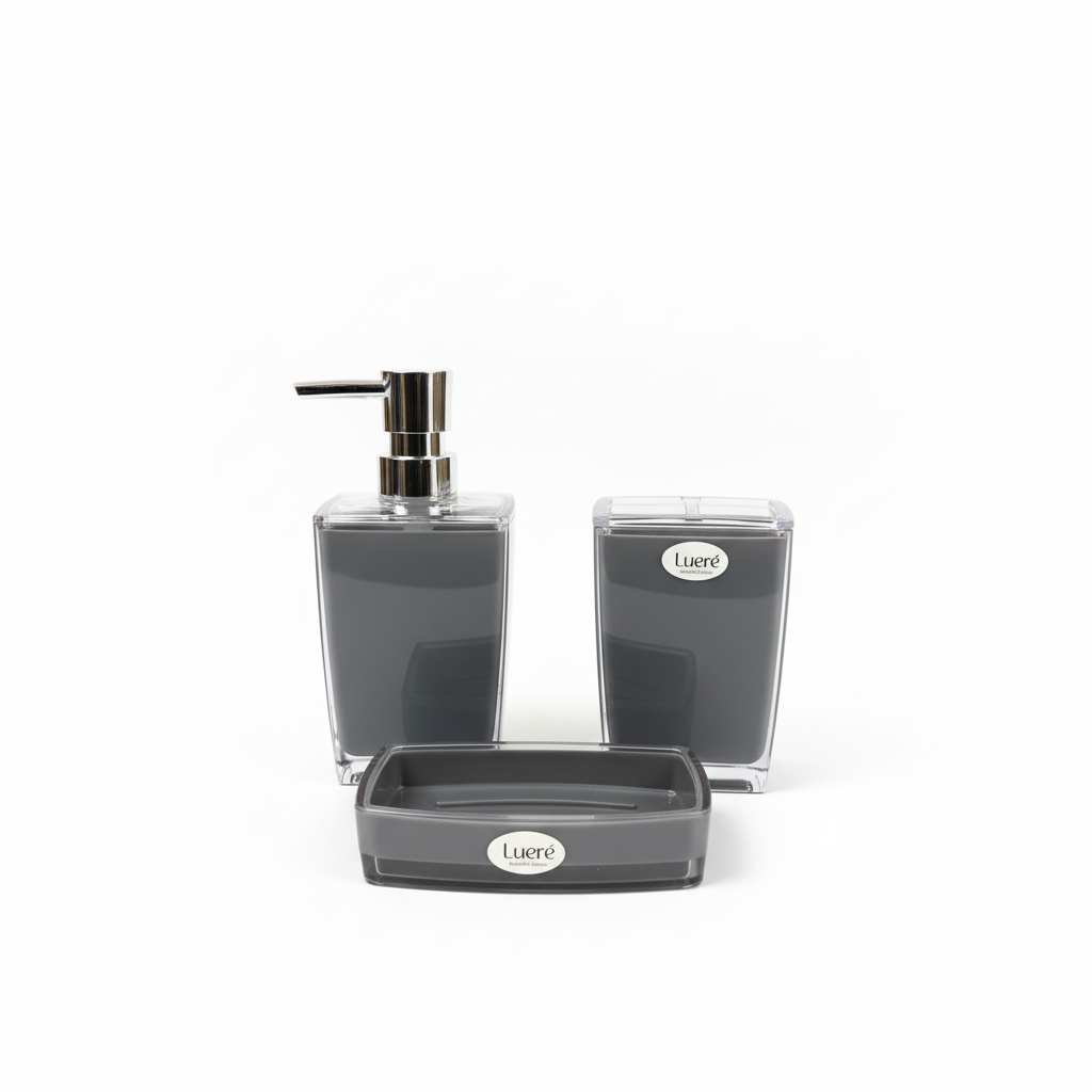 Set modern aksesorësh banjo Lueré në ngjyrë gri me dizajn drejtkëndor dhe mure të jashtme transparente, i përshtatshëm për lavaman ose sipërfaqe banjoje.
