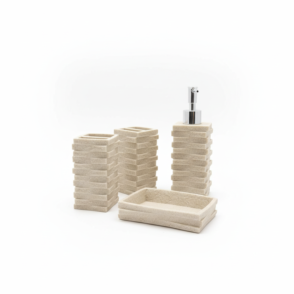 Set elegant aksesorësh banjoje me 4 pjesë të koordinuara në ngjyrë bezhe neutrale dhe dizajn me efekt guri të grumbulluar, ideal për përdorim mbi banak. I përshtatshëm për të organizuar çdo banjo me stil të unifikuar.