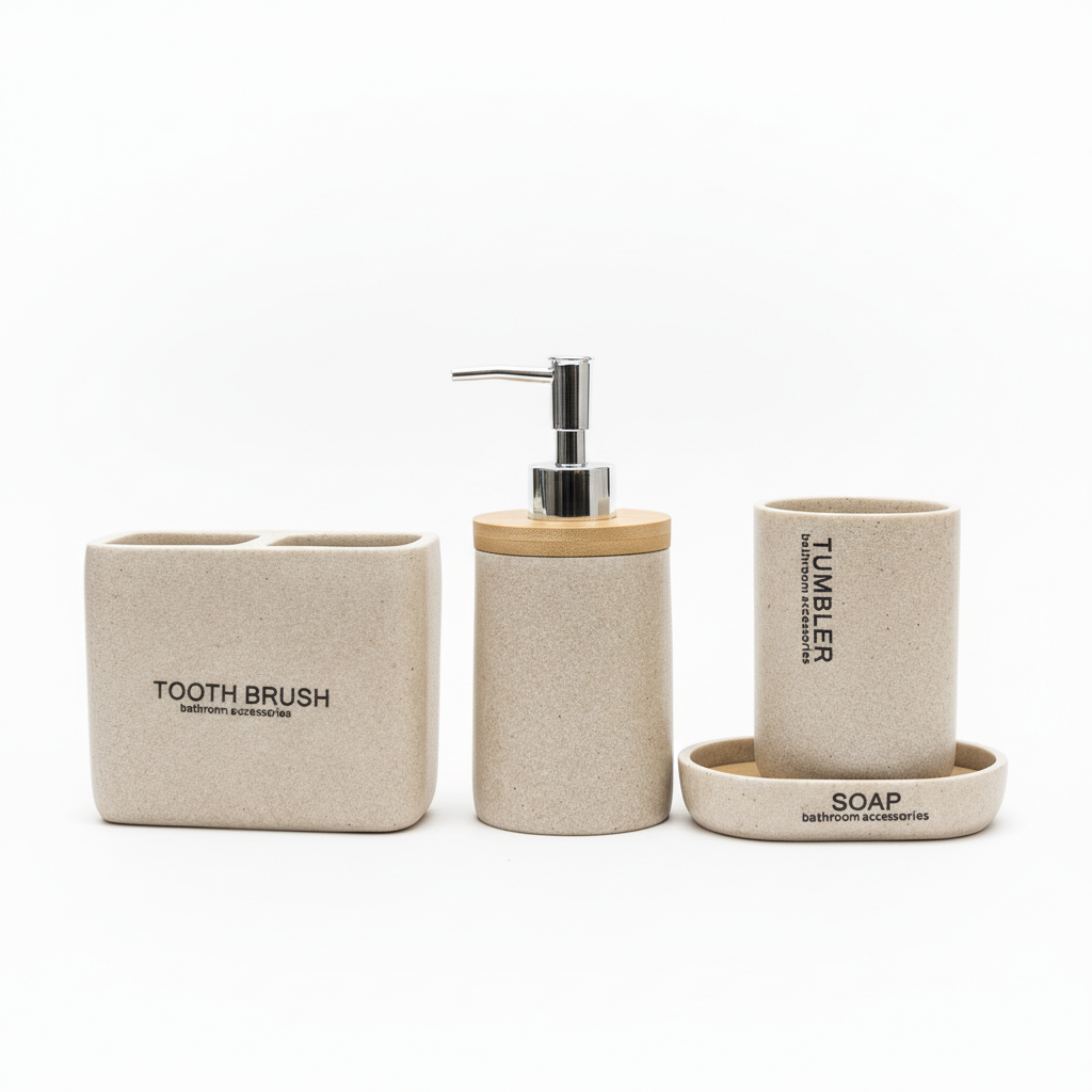 Seti prej 4 pjesësh sjell stil dhe funksionalitet në çdo banjo, me material në pamje guri bezhë që kombinohet lehtë me çdo dekor. Detajet në pamje druri në pjesën e sipërme të dozuesit i japin një prekje natyrale dhe moderne. Çdo pjesë është menduar për përdorim të përditshëm, duke mbajtur tavolinën e lavamanit të organizuar dhe elegante.