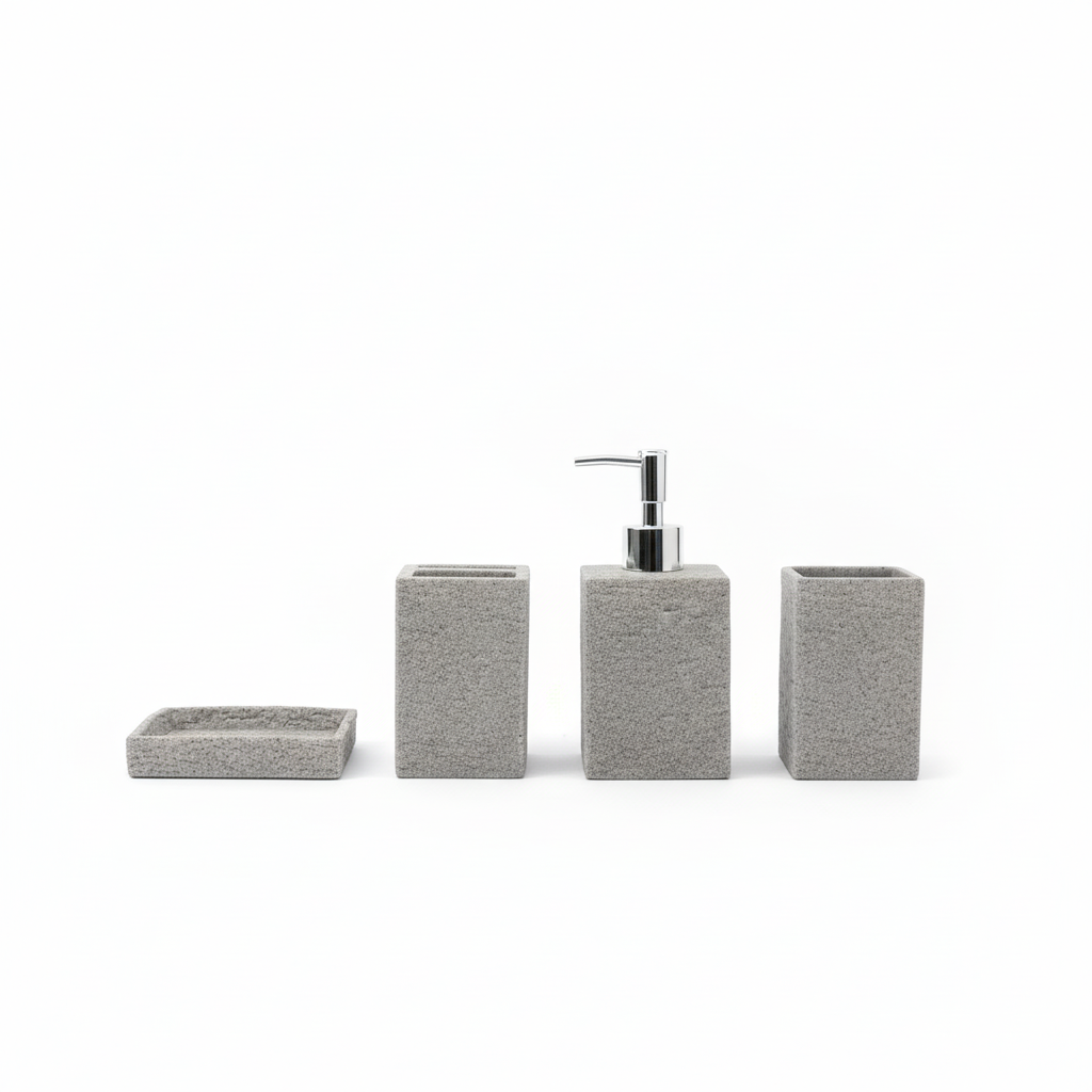 Set praktik aksesorësh banjoje me pamje moderne guri në ngjyrë gri dhe formë drejtkëndore. Ideale për të organizuar dhe unifikuar sipërfaqen e lavamanit.