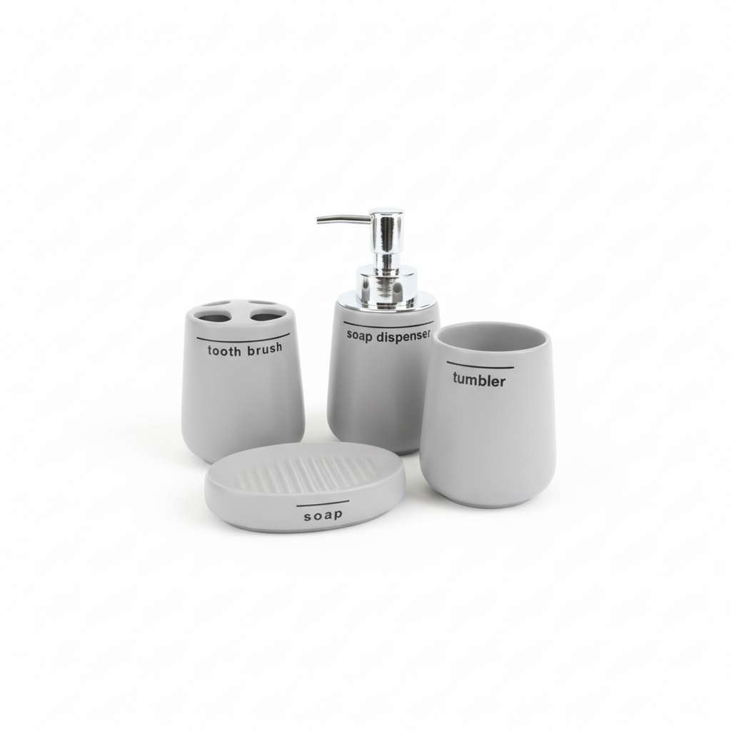 Set praktik me 4 aksesorë banje në ngjyrë gri mat për organizim të pastër në sipërfaqen e lavamanit. Çdo pjesë ka mbishkrim të qartë në anglisht për përdorim të thjeshtë dhe pamje moderne.