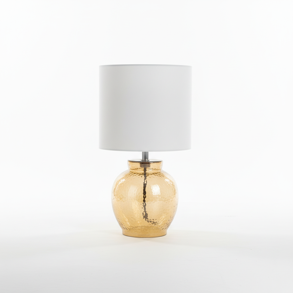 Kjo dritë tavoline sjell ndriçim të këndshëm dhe stil elegant, me bazë qelqi ngjyrë amber dhe abat-jour të bardhë prej cope për ambiente të brendshme.