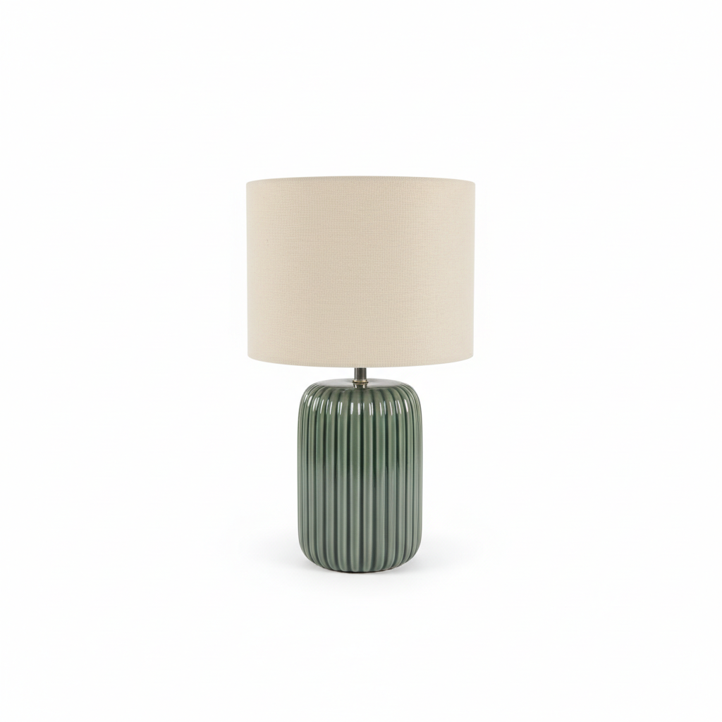 Kjo llambë tavoline sjell ndriçim të butë dhe stil modern në çdo hapësirë, falë bazës elegante prej porcelani me dizajn me vija vertikale dhe abazhurit tekstili në formë daulleje.