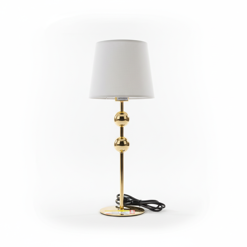 Ambazhuri elegant i tavolinës në ngjyrë ari me abazhure të bardhë pëlhure sjell dritë të këndshme dhe stil dekorativ në çdo ambient. Dizajni me sfera të grumbulluara e bën një aksesor tërheqës për dhomën e ndenjjes, zyrë apo dhomë gjumi.