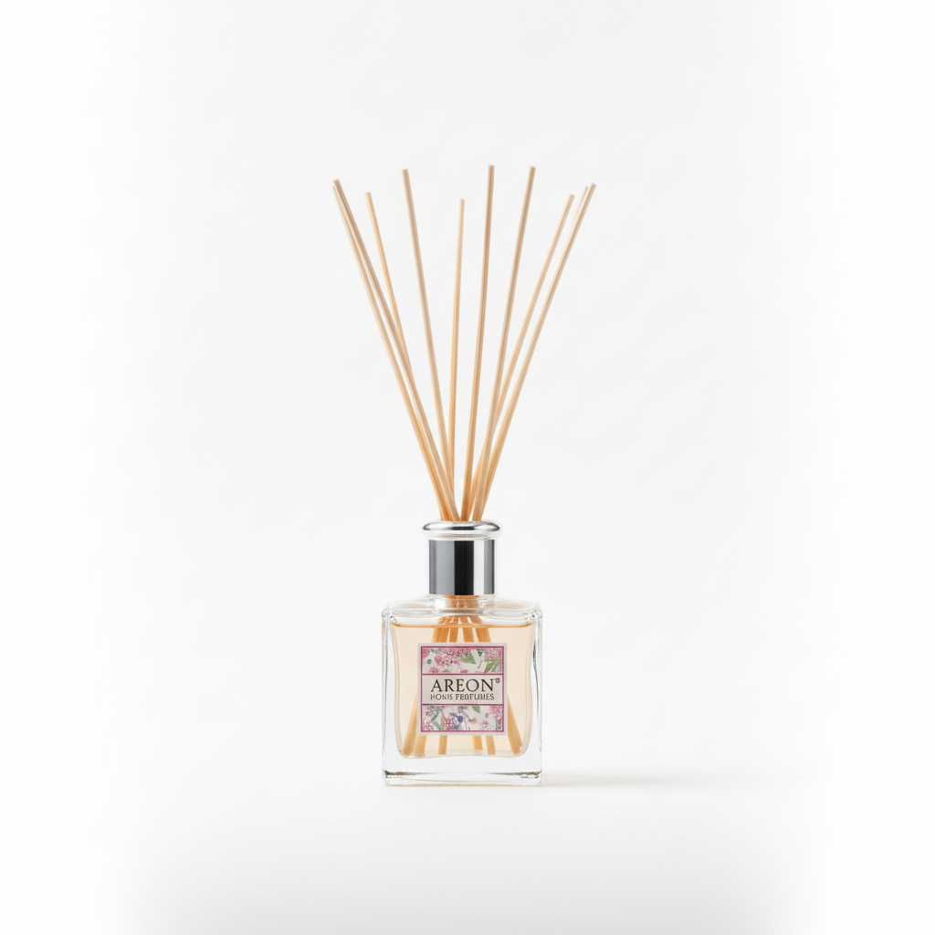 Difuzeri AREON Home Perfumes me aromë French Garden sjell një atmosferë të freskët dhe aromatike në shtëpinë tuaj, përmes shkopinjve përhapës dhe dizajnit dekorativ me motive lulesh.