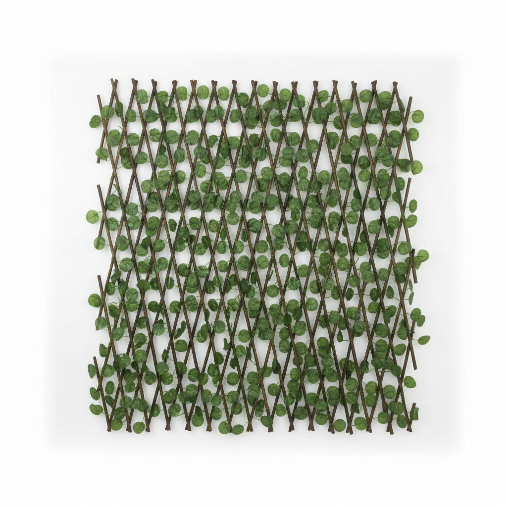 Panel dekorativ me strukturë rrjete zgjeruese, i veshur me gjethe artificiale jeshile dhe shkopinj në ngjyrë druri, ideal për të sjellë gjelbërim në çdo ambient.