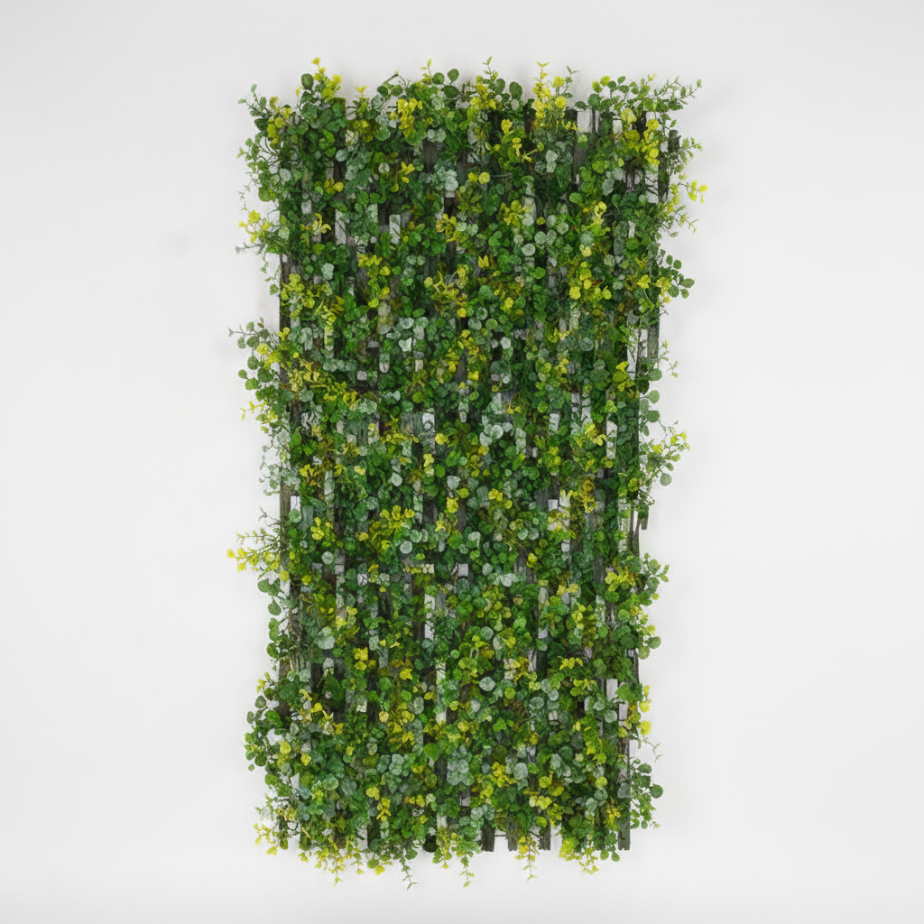 Panel dekorativ me gjethe artificiale të dendura në nuanca jeshile me aksente të verdha, ideal për mbulim muri ose krijim privatësie në ambiente të brendshme dhe të jashtme të mbrojtura. Dizenji i drejtkëndërt ofron pamje të gjelbër të vazhdueshme dhe moderne.