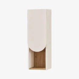 Ky raft muri me dizajn modern dhe minimalist është një zgjidhje elegante për organizimin dhe dekorimin e hapësirës. Forma e rrumbullakosur në pjesën e përparme krijon një pamje të butë dhe bashkëkohore, ndërsa kombinimi i ngjyrës së çelët me elementin në tonalitet druri i jep një karakter natyral dhe të ngrohtë.