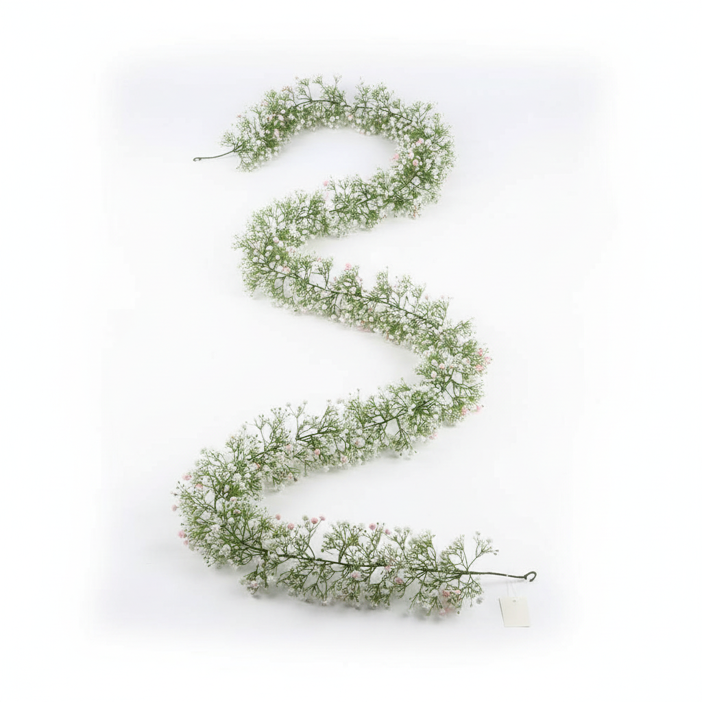 Varëse dekorative me hardhi jeshile dhe lule artificiale të vogla të bardha dhe rozë, e përshtatshme për zbukurimin e mureve, arkave, tavolinave dhe eventeve të ndryshme.