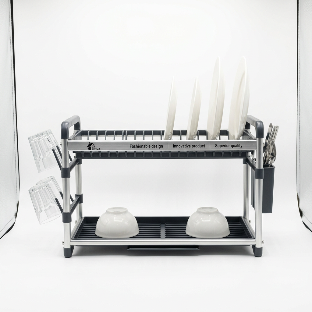Kjo tharëse enësh prej alumini të qëndrueshëm dhe rezistent ndaj ndryshkut kombinon dizajn modern me funksionalitet të lartë për të mbajtur lavamanin gjithmonë të rregullt. Struktura e fortë siguron tharje të sigurt të pjatave, gotave dhe filxhanëve, ndërsa dizajni i modës përshtatet lehtësisht me çdo stil kuzhine. Tabakaja e lëvizshme e kullimit e bën pastrimin dhe heqjen e ujit tepër të lehtë, duke reduktuar lagështinë dhe mykun përreth lavamanit. Mbajtësja e heqshme e takëmëve ofron fleksibilitet maksimal në organizim dhe kursim hapësire.