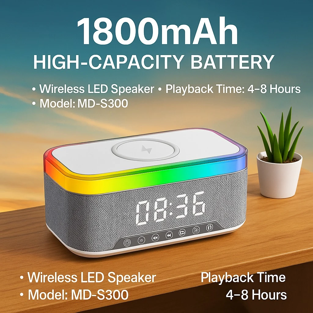 Boks Bluetooth MD-S300 me Orë Alarm LED, Karikim Wireless 15W dhe Dritë Ambienti