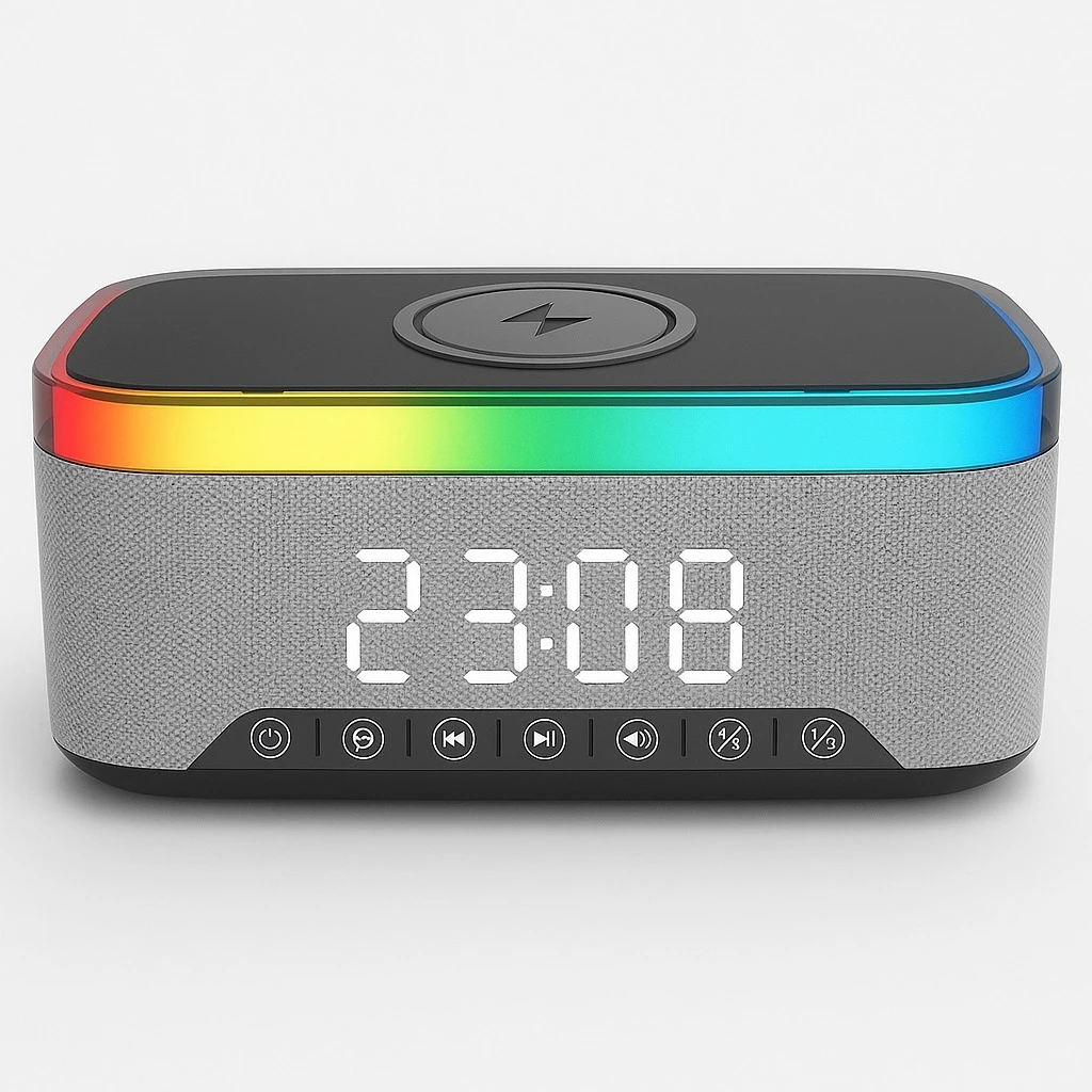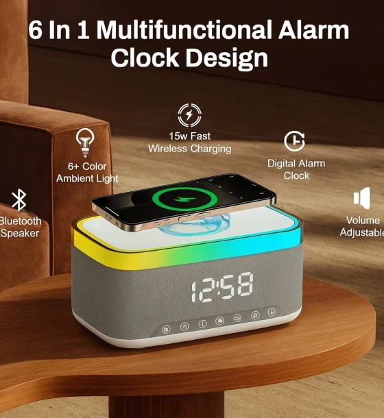 Dizajn 6-në-1: Boks Bluetooth, orë alarmi, ekran LED, ndriçim ambienti, karikim wireless dhe kontroll volumi.
