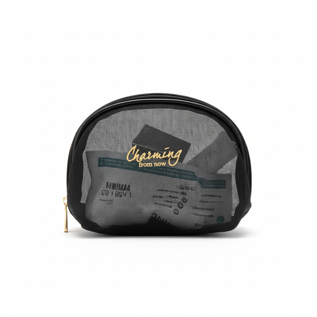Çantë kozmetike praktike me rrjetë në ngjyrë të zezë, ideale për organizimin e produkteve të bukurisë dhe aksesorëve të vegjël. Dizajni transparent i rrjetës lejon të shihni lehtësisht përmbajtjen, ndërsa mbishkrimi dekorativ "Charming from now" i jep stil modern.