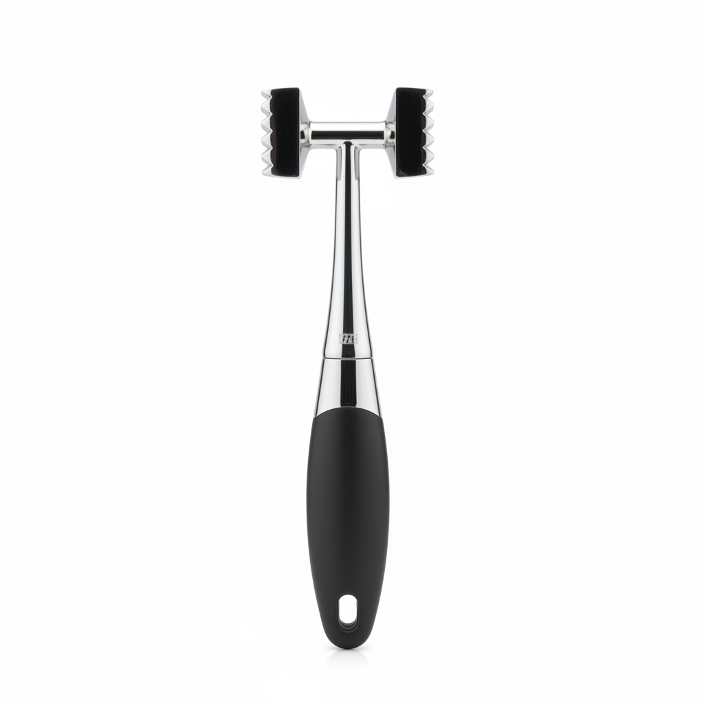 Çekiçi zbutës i mishit është mjet praktik kuzhine për zbutjen e copave të ndryshme të mishit, me kokë metalike me dy faqe dhe dorezë të rehatshme të zezë. Ideale për përdorim të përditshëm në shtëpi.