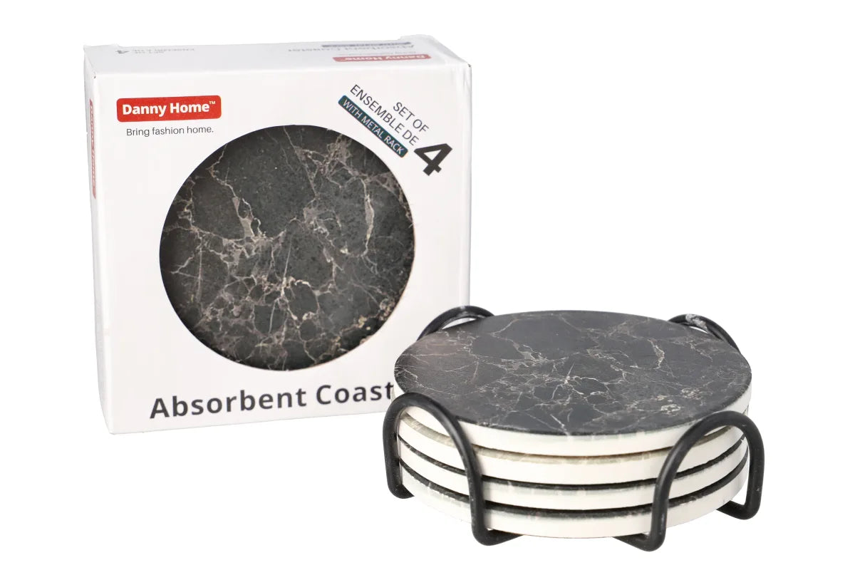 Mbajtëset tona të qëndrueshme dhe elegante prej mermeri krijojnë një sipërfaqe të fortë për gotat dhe filxhanët, duke parandaluar rrëshqitjen dhe derdhjen. Ndihmon në mbrojtjen e mobiljeve nga njollat e ujit dhe njollat e tjera, si dhe mbron tavolinat dhe banakët nga gërvishtjet. Vjen me stativ metalik.