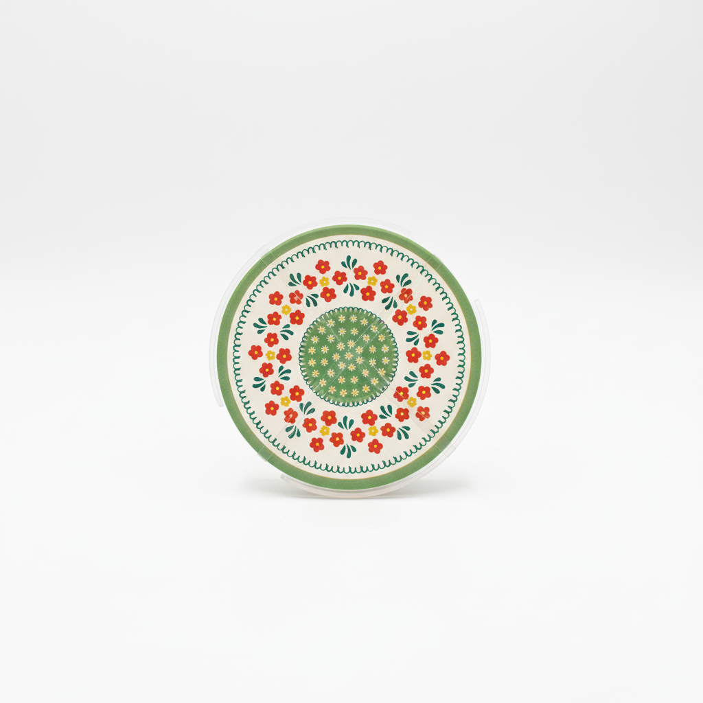 Set nënfilxhanësh rrethorë me motive lulesh, me pamje si pllaka guri dhe me mbajtëse transparente, i krijuar për të mbrojtur sipërfaqet nga pijet e ftohta. Dizajni dekorativ shton stil në tryezën tuaj të kuzhinës apo ngrënies.