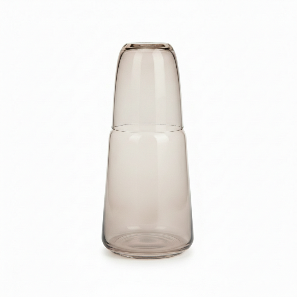 Set elegant qelqi i punuar me dorë, ideal për t’u mbajtur pranë shtratit, në zyrë ose në kuzhinë për shërbimin e përditshëm të ujit dhe pijeve të tjera. Gotë e përshtatur që vendoset sipër karafës si kapak ofron zgjidhje higjienike dhe kursen hapësirë në çdo sipërfaqe. Ngjyra bezhe transparente i jep çdo ambienti një prekje moderne dhe të ngrohtë.