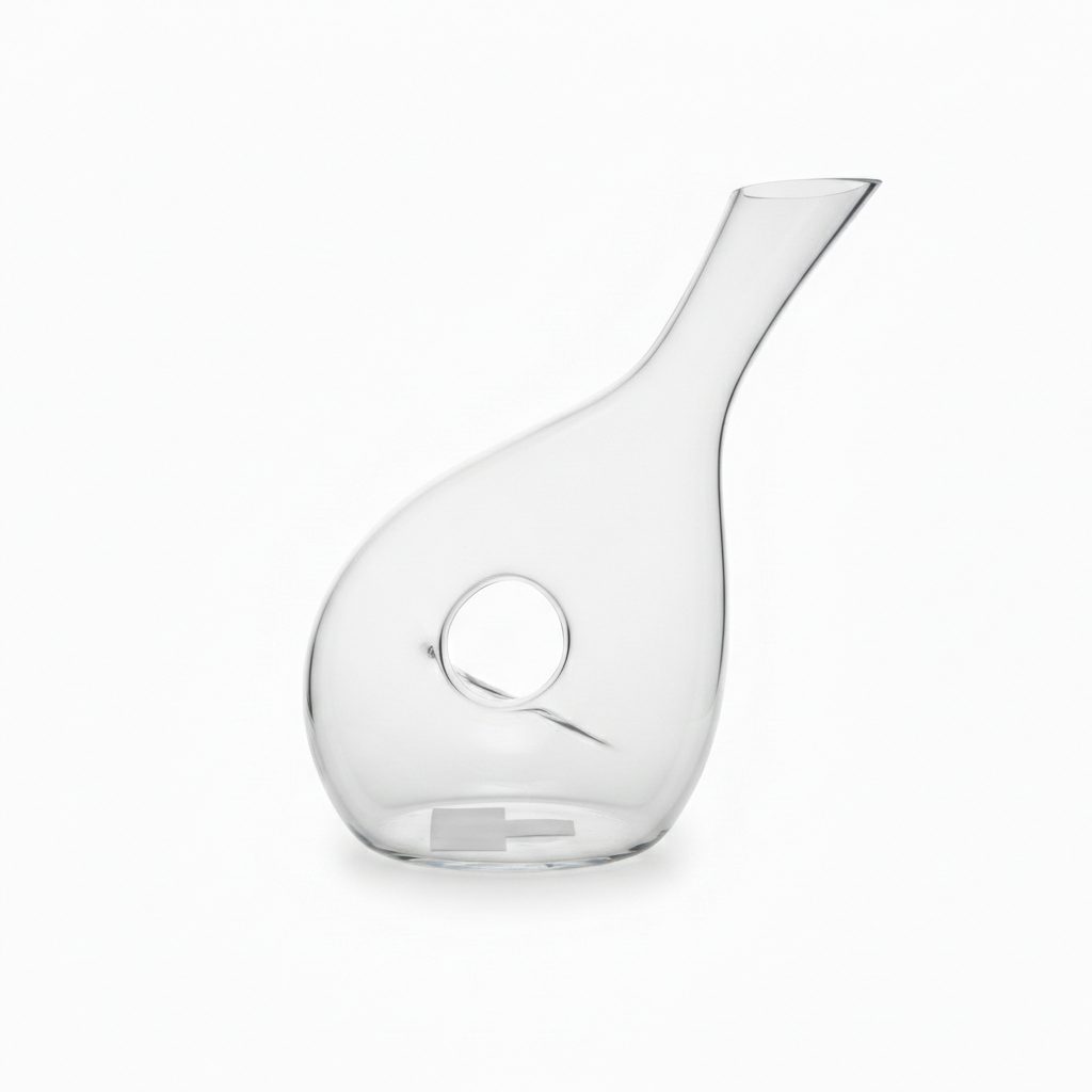 Dekantues elegant nga kristal pa plumb, i punuar me dorë, me formë moderne të lakuar dhe vrimë qendrore për kapje të sigurt dhe servirje të lehtë. Qafa e gjatë e pjerrët lejon aerimin optimal të verës, duke nxjerrë në pah aromat dhe shijet më të mira në çdo gotë. I përshtatshëm si për dekantim ashtu edhe për servirje profesionale në shtëpi apo restorant.