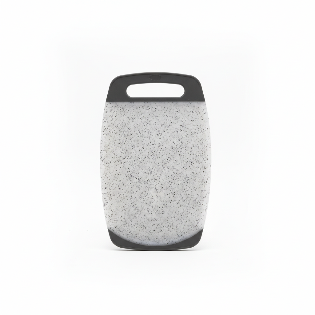 - Sipërfaqe e sheshtë me pamje mermeri gri me pika për prerje të ndryshme ushqimesh.
