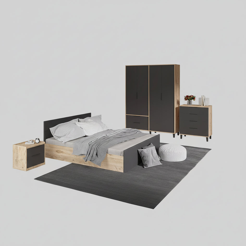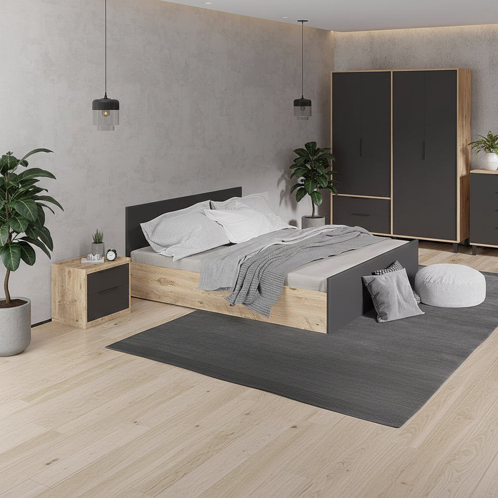 Transformoni dhomën tuaj të gjumit në një ambient bashkëkohor me setin Floria. I krijuar me melaminë të cilësisë së lartë, ky koleksion kombinon mrekullisht dekorin e ngrohtë të drurit natyral me panelet në ngjyrë gri të errët (antracit), duke ofruar një estetikë "te paster" dhe shumë të rafinuar.