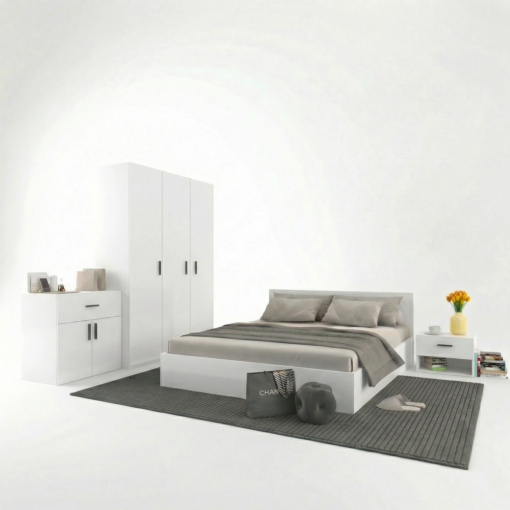 Krevati ofron një strukturë të qëndrueshme dhe komode, ndërsa garderoba dhe komoda sigurojnë hapësirë të bollshme për organizimin e rrobave dhe aksesorëve. Komodina pranë krevatit plotëson setin me një zgjidhje praktike për përdorim të përditshëm.