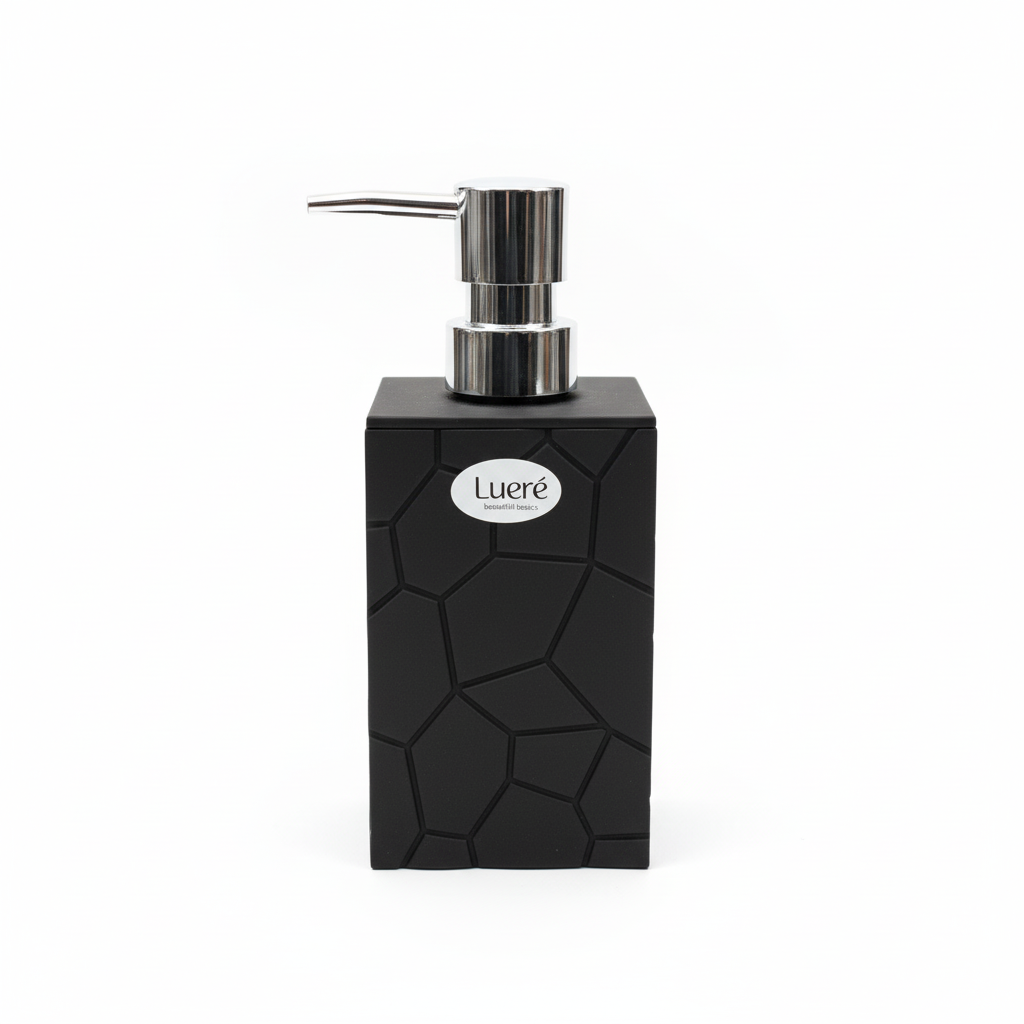 Dozuesi gjeometrik i sapunit nga Lueré sjell një pamje moderne dhe të rregullt pranë lavamanit në banjo ose kuzhinë. Shishja drejtkëndëshe me sipërfaqe me teksturë guri kombinohet me pompën me ngjyrë kromi për një prekje elegante.
