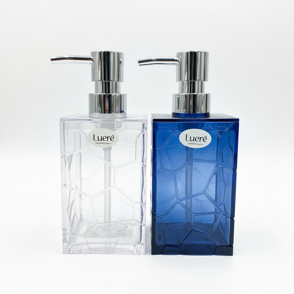 Dispenseri i sapunit Lueré me formë drejtkëndore dhe teksturë gjeometrike sjell një pamje moderne në banjën tuaj. I disponueshëm në ngjyrë transparente dhe blu të errët, ai kombinohet lehtësisht me aksesorë të tjerë.