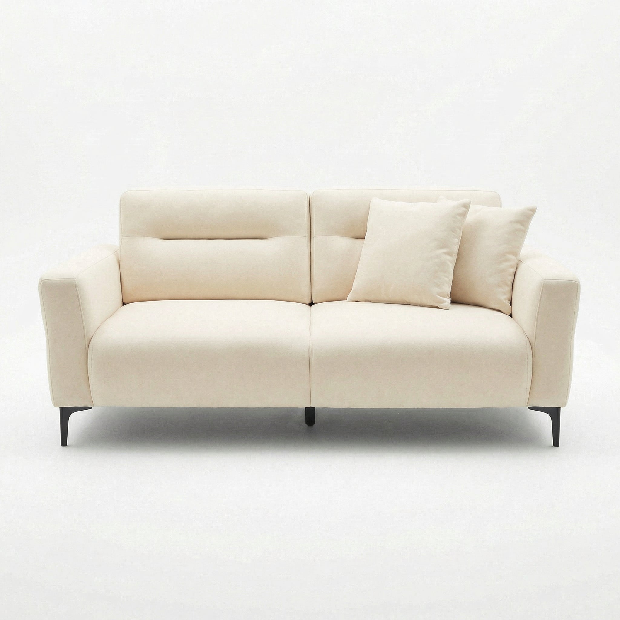 Këmbët metalike të zeza i shtojnë një kontrast modern dhe stabilitet strukturor, ndërsa silueta e ngritur i jep divanit një pamje “light & airy”.