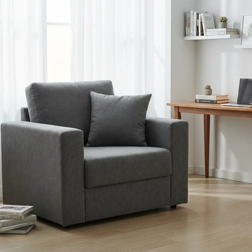 E veshur me një pëlhurë të butë në ngjyrë gri të errët, Artemis përshtatet lehtësisht me çdo dekor modern apo minimalist. Sekreti i saj qëndron te funksionaliteti: me një mekanizëm të thjeshtë hapjeje, kjo poltronë transformohet në një shtrat të vogel. Është zgjedhja perfekte për dhomën e ndenjes, dhomën e miqve, apo edhe për apartamente pushimi ku hapësira është e çmuar.