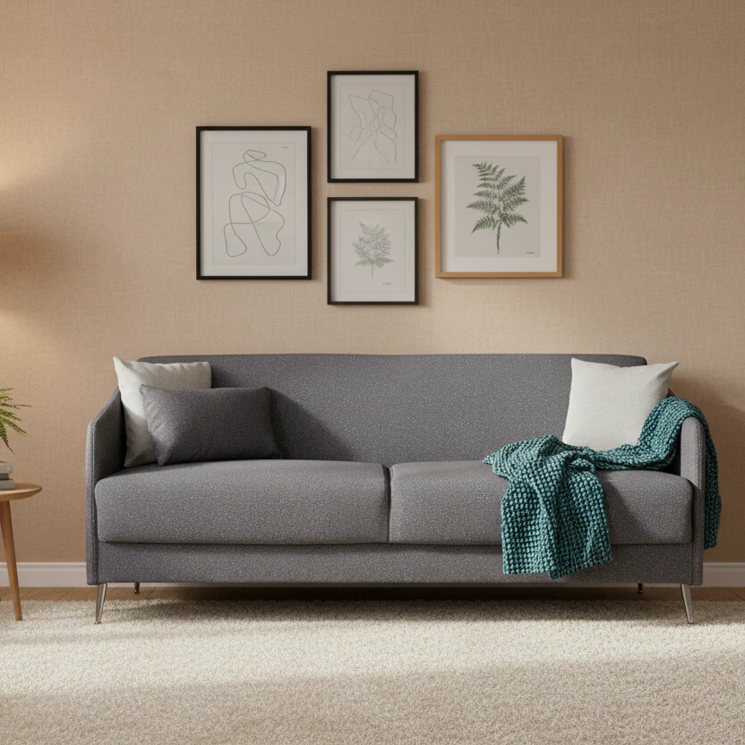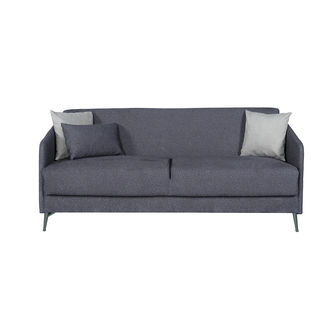 Ngjyra gri e errët e pëlhurës krijon sfondin perfekt për jastëkët dekorativë të përfshirë, duke ofruar një lojë ngjyrash të balancuar. I gjithë divani qëndron mbi këmbë metalike me shkëlqim, të cilat shtojnë një notë luksi dhe e bëjnë pastrimin e dyshemesë shumë të thjeshtë.
