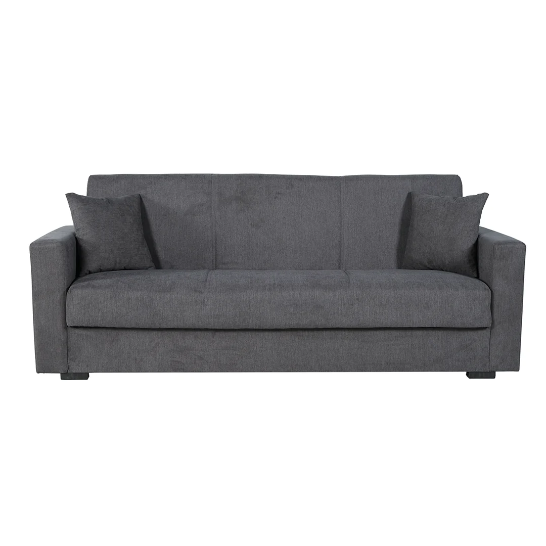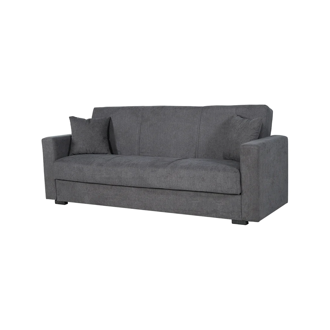I veshur me një pëlhurë të qëndrueshme në ngjyrë gri të errët (Antracit), Artemis ofron hapësirë të bollshme për tre persona. Krahët e gjerë katrorë shtojnë karakter dhe ofrojnë mbështetje të rehatshme. Divani vjen i shoqëruar me dy jastëkë dekorativë në të njëjtën nuancë, të cilët mund t'i përdorni për rehati shtesë ose si jastëkë gjumi.