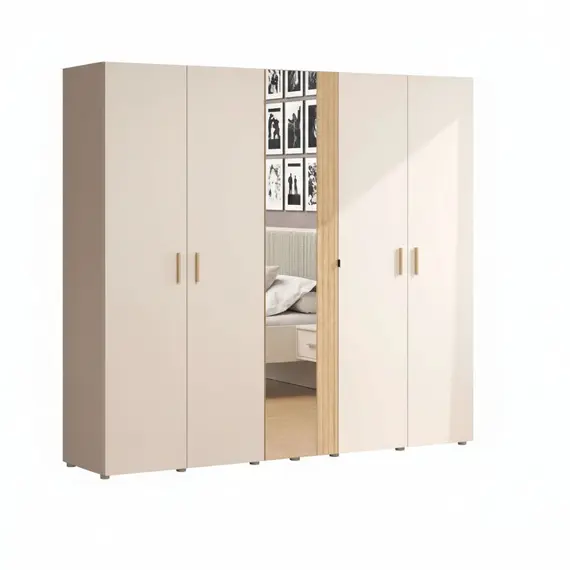 Ky dollap me pesë dyer dhe pasqyrë qendrore është zgjidhje ideale për organizim të plotë në dhomën e gjumit. Kombinimi i ngjyrës neutrale me detaje druri krijon një pamje moderne dhe të ngrohtë, ndërsa pasqyra e integruar shton funksionalitet dhe ndjesinë e hapësirës.
