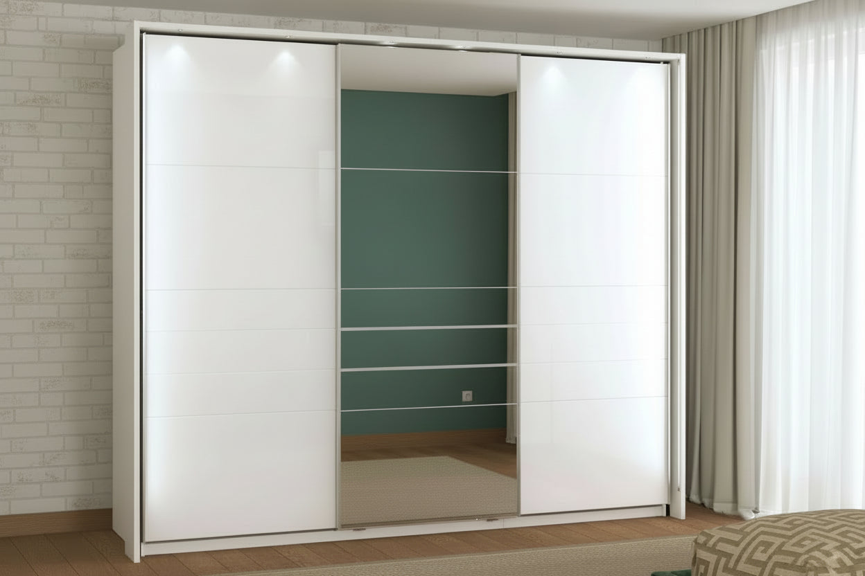 Dollapi është një zgjedhje moderne dhe elegante për organizimin e garderobës në dhomën e gjumit. Me dizajn minimalist dhe linja të pastra, ky dollap përshtatet lehtësisht me ambiente bashkëkohore duke krijuar një pamje të rregullt dhe harmonike.Dollapi është i pajisur me dyer rrëshqitëse, të cilat kursejnë hapësirë dhe ofrojnë përdorim praktik në përditshmëri. Paneli qendror me pasqyrë jo vetëm që shton funksionalitet, por gjithashtu reflekton dritën dhe krijon ndjesinë e një ambienti më të madh dhe më të ndritshëm.Brenda ofron hapësirë të bollshme për organizimin e rrobave dhe aksesorëve, duke e bërë ideal për përdorim të përditshëm dhe për ruajtje të rregullt të garderobës.