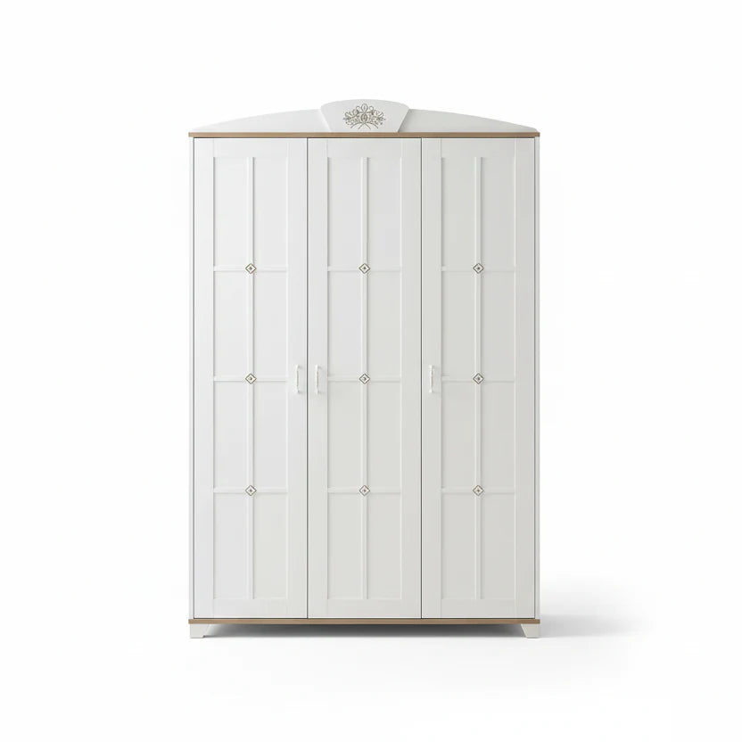 Kjo garderobë me dizajn klasik dhe ngjyrë të bardhë është një zgjedhje elegante për dhomën e gjumit ose ambientet rinore. Linjat e pastra dhe detajet dekorative në dyer krijojnë një pamje të rafinuar dhe të përjetshme që përshtatet lehtësisht me stile të ndryshme interieri.