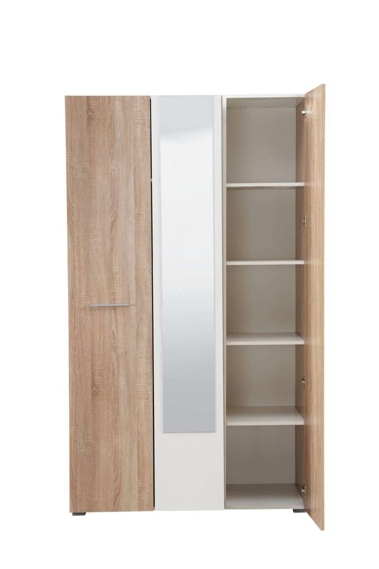 Ky dollap me tre dyer është një zgjidhje funksionale dhe estetike për organizimin e rrobave dhe aksesorëve në dhomën e gjumit. Kombinimi i ngjyrës së lisit natyral me të bardhën krijon një pamje të pastër dhe moderne, ndërsa pasqyra e integruar shton praktikë dhe ndriçim vizual në hapësirë.