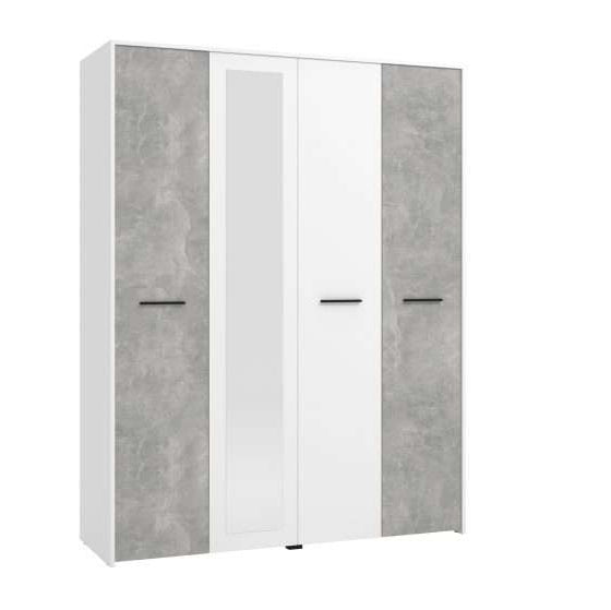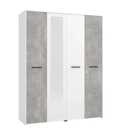 Dollapi me katër dyer në kombinim të bardhë me efekt betoni sjell një stil modern dhe urban në dhomën e gjumit. Dizajni i pastër me linja minimaliste dhe pasqyra qendrore krijon ndjesi hapësire dhe ndriçimi, ndërsa hapësira e brendshme ofron organizim praktik për rrobat dhe aksesorët tuaj të përditshëm.