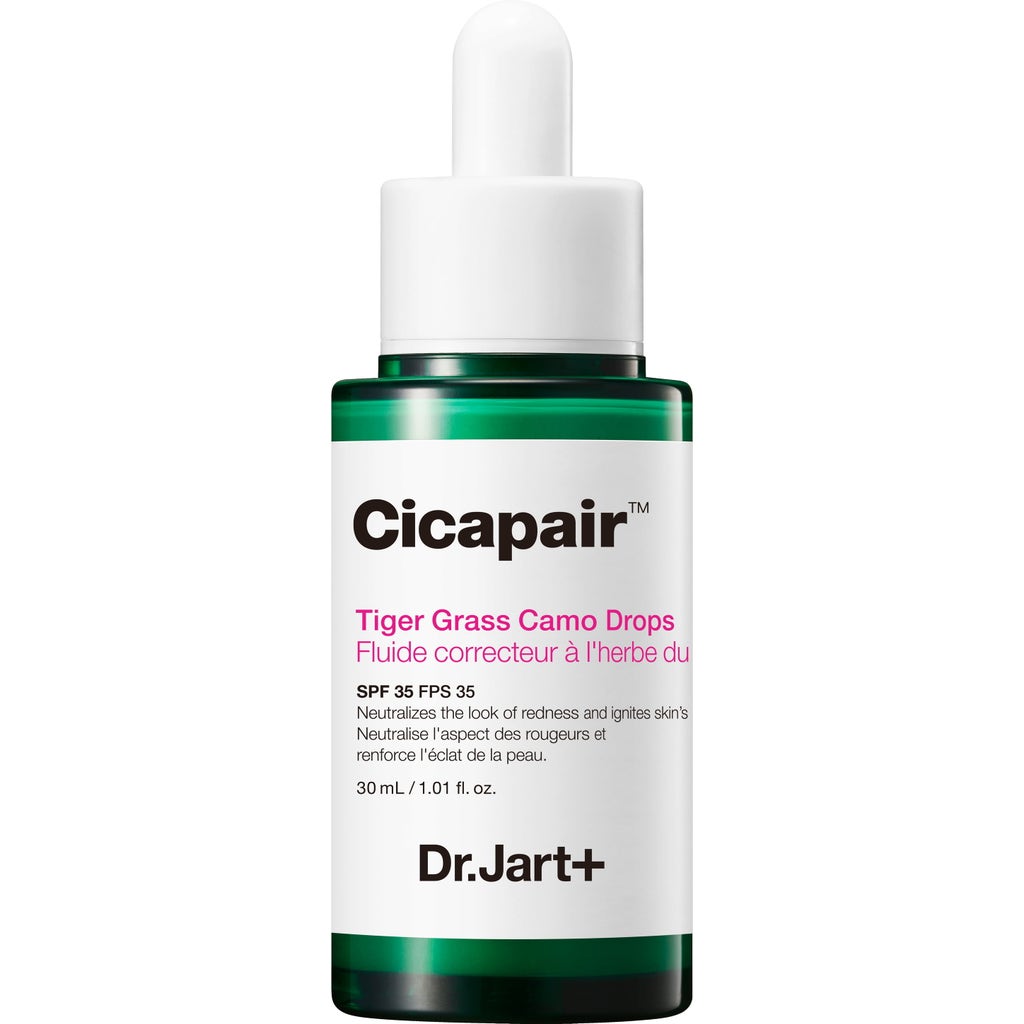 Dropat e kamuflazhit Cicapair™ Tiger Grass SPF 35 nga Dr. Jart+ përshtaten individualisht me çdo ton lëkure dhe për këtë arsye mund të neutralizojnë dhe barazojnë zonat e irrituara në fytyrë. Lëkura duket më e njëtrajtshme dhe pamja menjëherë fillon të shkëlqejë përsëri. Formula me niacinamidë ka një efekt mbrojtës, ndërsa tigër grass qetëson dhe qetëson lëkurën. Falë oksidit të zinkut dhe dioksidit të titaniumit, serumi me një faktor mbrojtjeje nga dielli prej 35 mbron gjithashtu nga rrezet UVA dhe UVB.