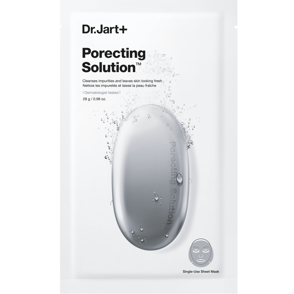 Zgjidhja Dermask™ Porecting Solution nga Dr Jart+ është një maskë për fytyrën me qymyr aktiv që flluskon dhe Phlorogine, një ekstrakt algash që zvogëlon në mënyrë efektive yndyrën e tepërt. Maska pastron poret duke hequr papastërtitë për një lëkurë më të lëmuar dhe më të freskët. Sebumi minimizohet në mënyrë të qëndrueshme, duke krijuar një ekuilibër të mirë të yndyrës dhe lagështisë. Aplikimi është unik, pasi flluska të holla të bardha ngrihen dukshëm në sipërfaqen e fletës së zezë të qymyrit të aktivizuar. Efekti i masazhit e bën aplikimin edhe më të këndshëm dhe stimulues.