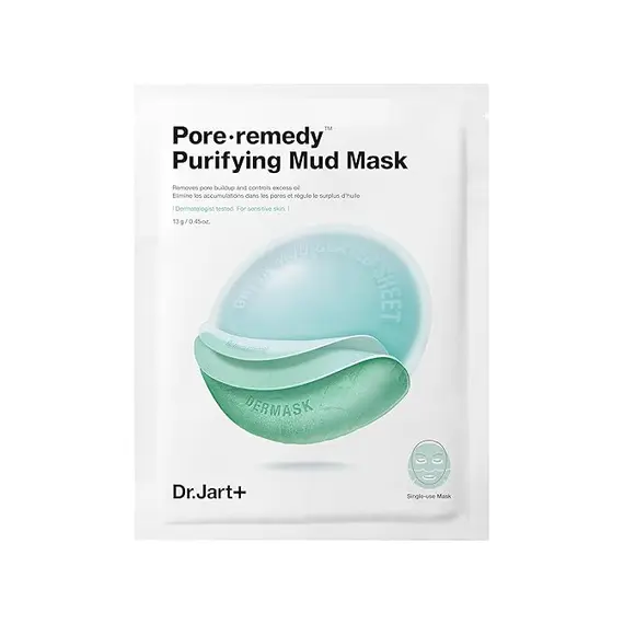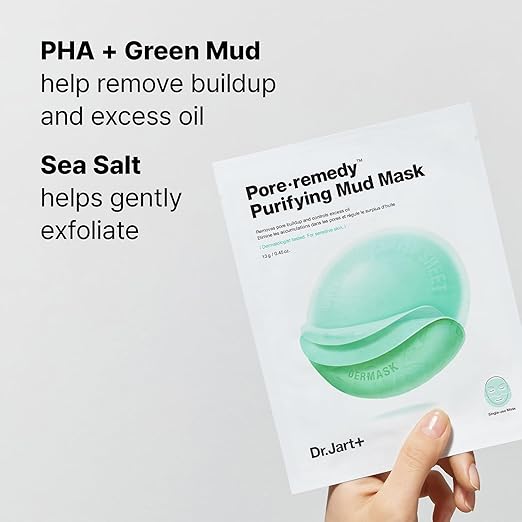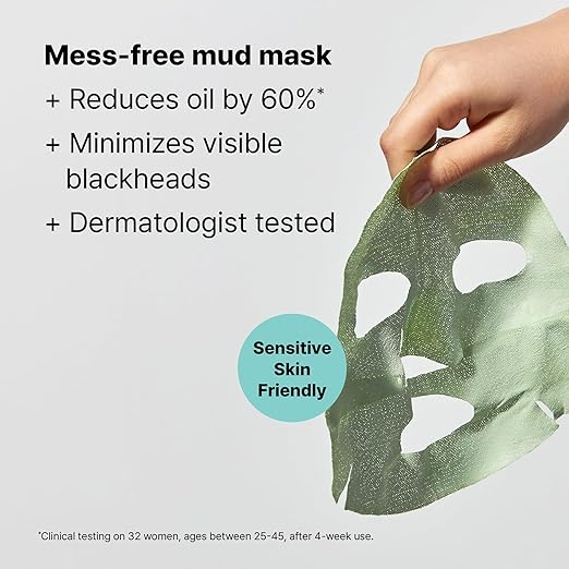 Një maskë prej flete e veshur me baltë jeshile pa rrëmujë që largon grumbullimin, yndyrën e tepërt dhe zbut lëkurën me një përdorim të vetëm dhe pa e dehidratuar atë.