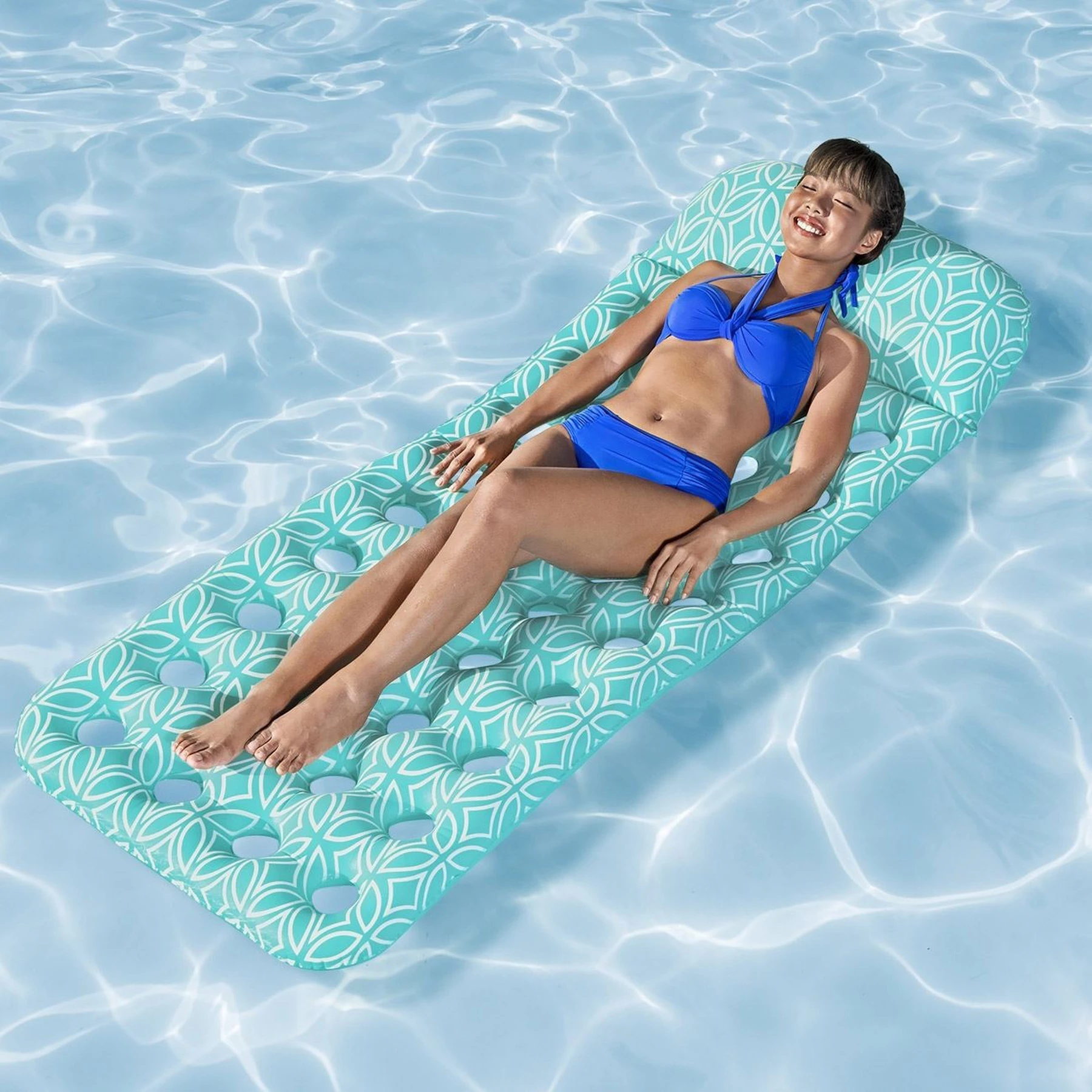 Dyshek uji turkuaz me dizajn aztek I bardhë , me sipërfaqe të butë si kadife. Pesha Maksimale: 100kg 1.98x0.74m. Përdoret vetëm nën mbikëqyrjen e të rriturve. Moshë e Përshtatshme: 14+ vjeç