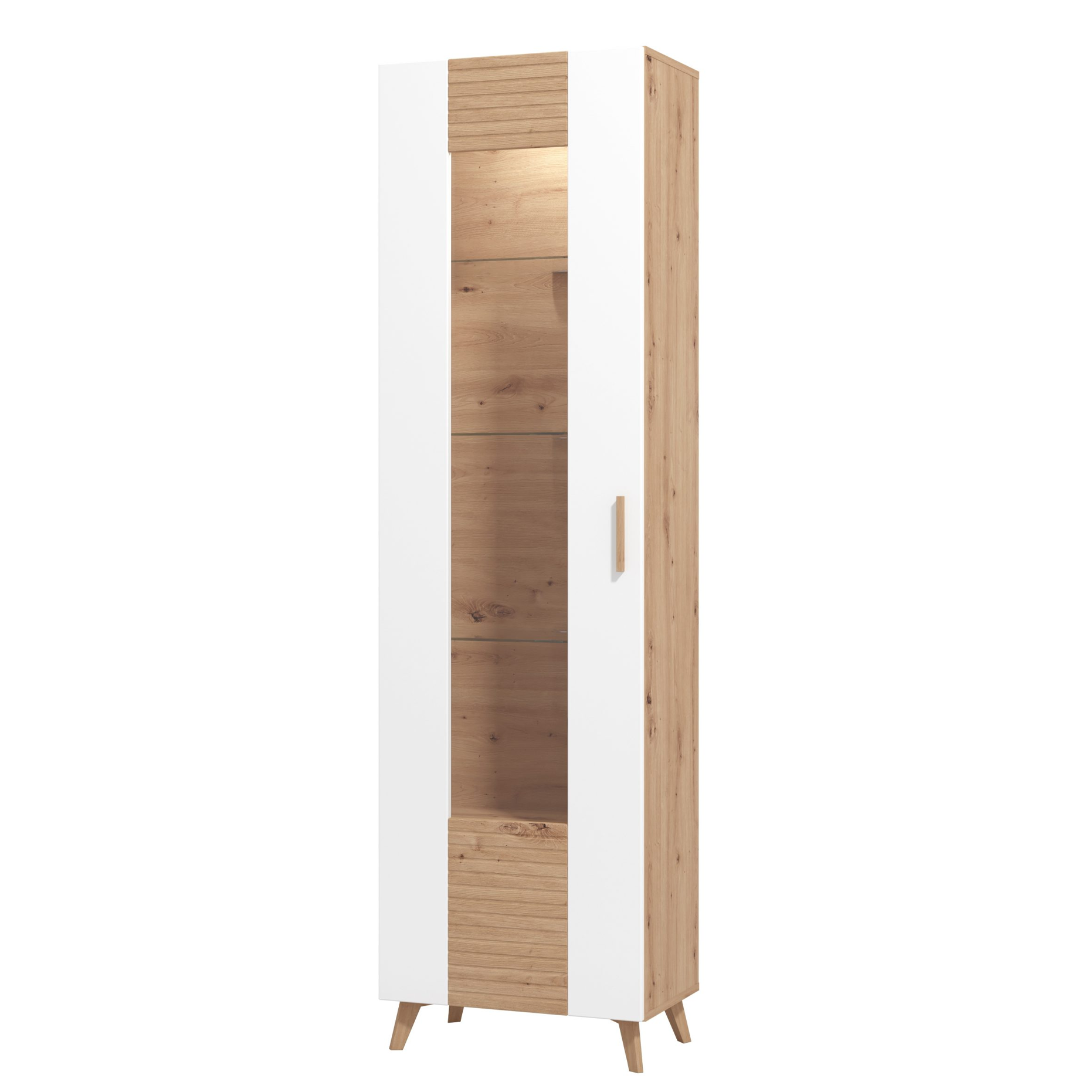 Ekspozitor me dizajn elegant që kombinon ngjyrën e bardhë me efektin natyral të drurit, duke krijuar një pamje të ngrohtë dhe bashkëkohore. Pjesa me xham lejon ekspozimin e objekteve dekorative, librave apo aksesorëve, ndërsa ndriçimi i brendshëm shton një prekje sofistikuar në ambient. Forma e ngushtë dhe e lartë e bën ideale edhe për hapësira të kufizuara.