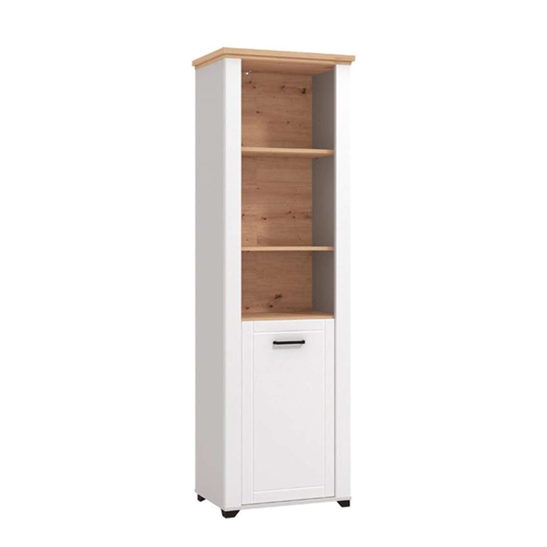 Ekspozitor me stil modern dhe linja të pastra, ideale për organizimin dhe ekspozimin e librave, dekorimeve apo aksesorëve të ndryshëm. Kombinimi i ngjyrës së bardhë me elementët në efekt druri krijon një atmosferë të ngrohtë dhe elegante në çdo ambient. Pjesa e poshtme me derë ofron hapësirë shtesë ruajtjeje për sende që dëshironi t’i mbani të fshehura.